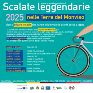 Scalate leggendarie nelle Terre del Monviso giunge alla sua quarta edizione dopo aver visto la partecipazione di circa 10.000 appassionati ciclisti nel corso delle prime tre. L’evento è organizzato da Terres Monviso con il sostegno di risorse dell’Unione Europea nell’ambito del programma Interreg Italia-Francia ALCOTRA, dalle Unioni Montane Valle Stura, Valle Grana, Valle Maira, Valle Varaita, Comuni del Monviso e Barge-Bagnolo e dal Comune di Saluzzo con la collaborazione tecnica di Velo Caraglio e Vigor Cycling Team. Anche nell’edizione di quest’anno viene promosso insieme all’analoga proposta francese chiamata Tournée des Grand Cols, che si svolge da lunedì 30 giugno a venerdì 4 luglio, con salite al Col du Galibier (30 giugno), al Col du Granon (1° luglio), al Col de l’Échelle (2 luglio), al Col d’Izoard (3 luglio) e al Colle dell’Agnello (4 luglio) creando in questo modo un interessante prodotto turistico transfrontaliero dedicato agli appassionati della bicicletta.